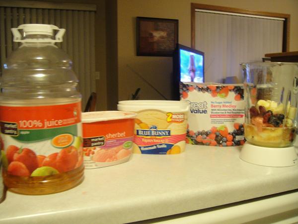 I usually use ice but hate the taste, too watery. I used frozen yogurt instead and skip the sherbet (too much sugar), last night I thru in some old strawberry protein powder and it ruined the taste. I also use milk instead of juice, I use chocolate milk. I love choc/strawberry shakes. |