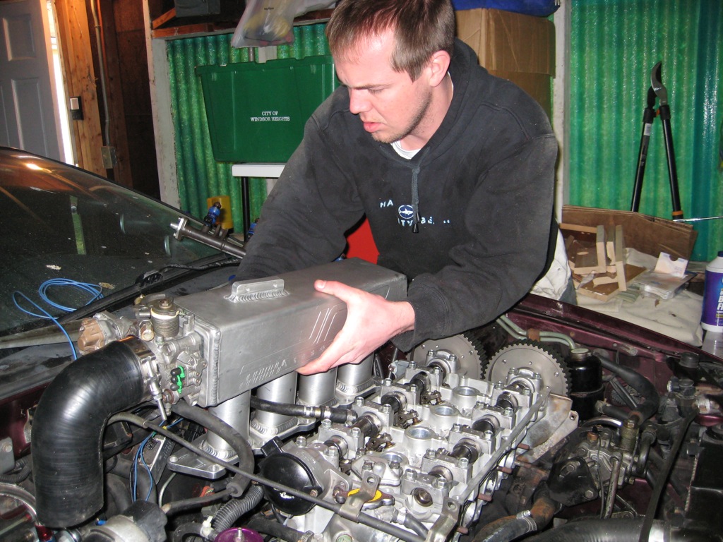 After the head was on I got the intake manifold installed and plug wires routed, as well as all the sensors plugged in. The only things left are to bolt on the turbo, do the timing belt, and put the oil pan back on. It should be up and running by Thursday at the latest.