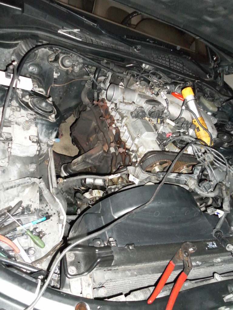 Got to spend a couple hours on her this evening. Here's where she sits today. TB is almost off, but there's one coolant hose on the IM side still hooked to it that seems to be a little tricky...