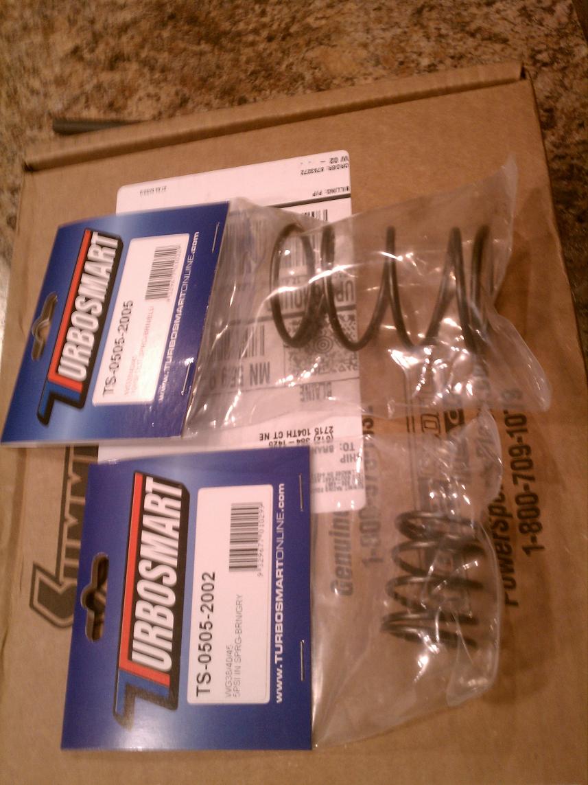 - New WG springs. I believe the one I have in there is a 7psi spring. These are a 5 and a 10. So with all 3 in there I should be at a base psi of 22psi. Should be a good base setting I think, then turn it up to 30-35 with the MBC.