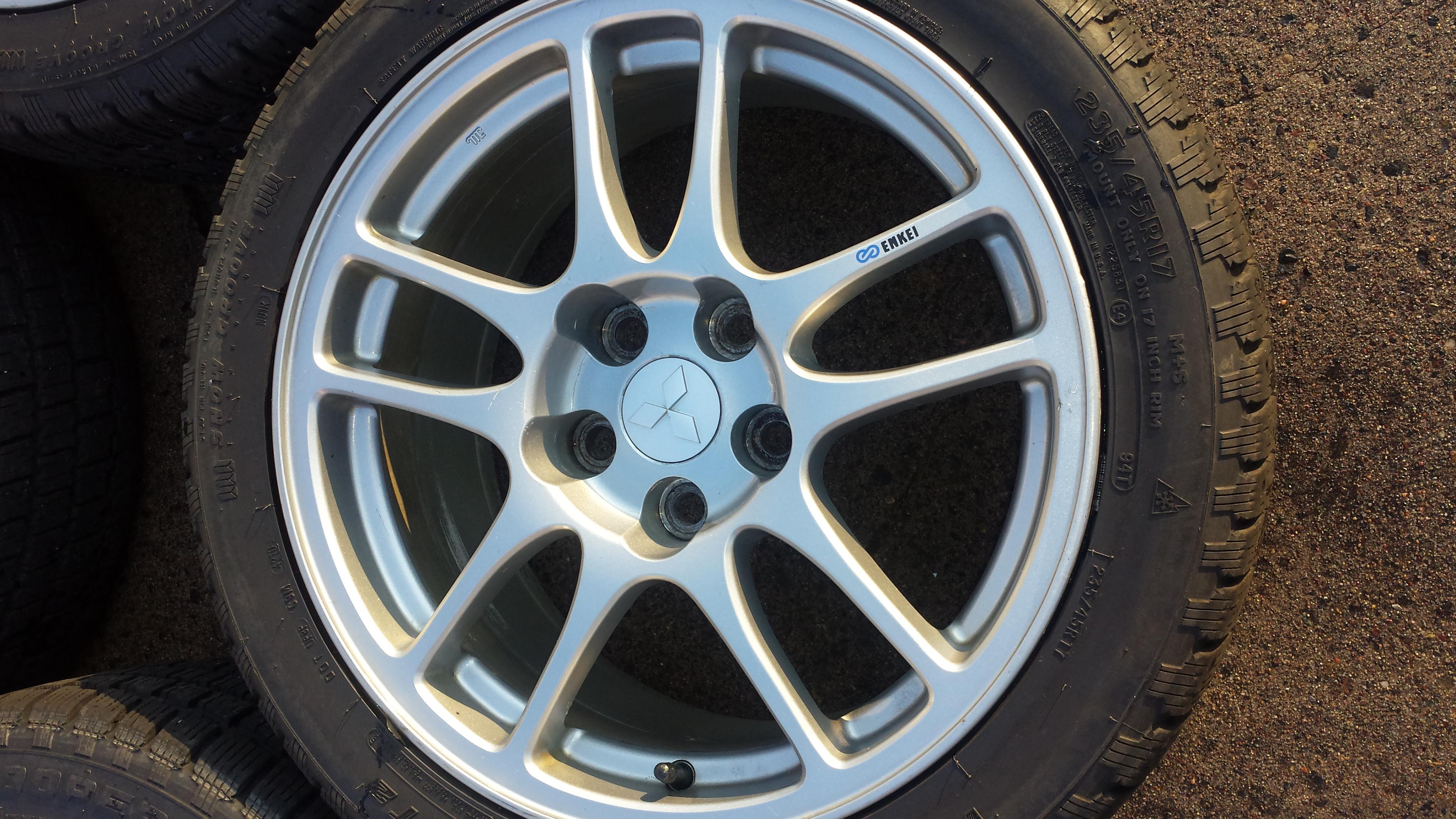 Selling some Evo 9 Enkei wheels. They currently have snow tires on them, Cooper Weather-master 235/45/17. Two tires are like new, the other two are worn in the inner shoulder from a poor alignment but are still very usable. Have no need for them any more. Wheels are in very good condition with no curb rash.