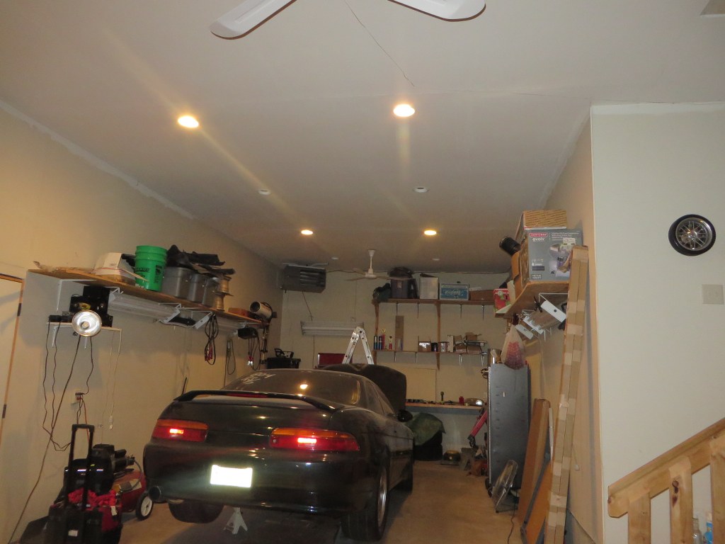 99.9% there. I have the two switches installed in the new location and wired up so one turns on half, and the other turns on the other half. I also have the fan switch wired up which controls all three fans. I do still need to anchor the fans (you can see the anchor cable still dangling). And then the ceiling portion of this project is pretty much done and time to come up with a plan for a new shelving/storage layout. Overall I'm very happy with how this turned out, but it did prove that I still need some sort of side/front lighting like my old fluorescents were. The garage is extremely well lit, but working under the hood of the car is dark.