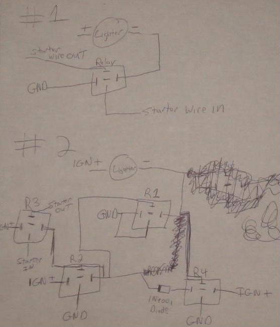 I wrote this in like 5 mins, and I haven't had a chance to test it out, I will do so in the next few days to make sure it works as its supposed to and I will try to simplify it so 4 relays aren't needed as well.Circuit #2 assumes the lighter is controlled by the IGN as it is in my 2G, I can't remember if its that way in the 1G's.If it isn't, relays#2,#3 need an IGN power, otherwise you can run #2,#3 off the lighters IGN power wire.Any questions ASK ME before you go fry your shit.I hope no car theives frequent this board