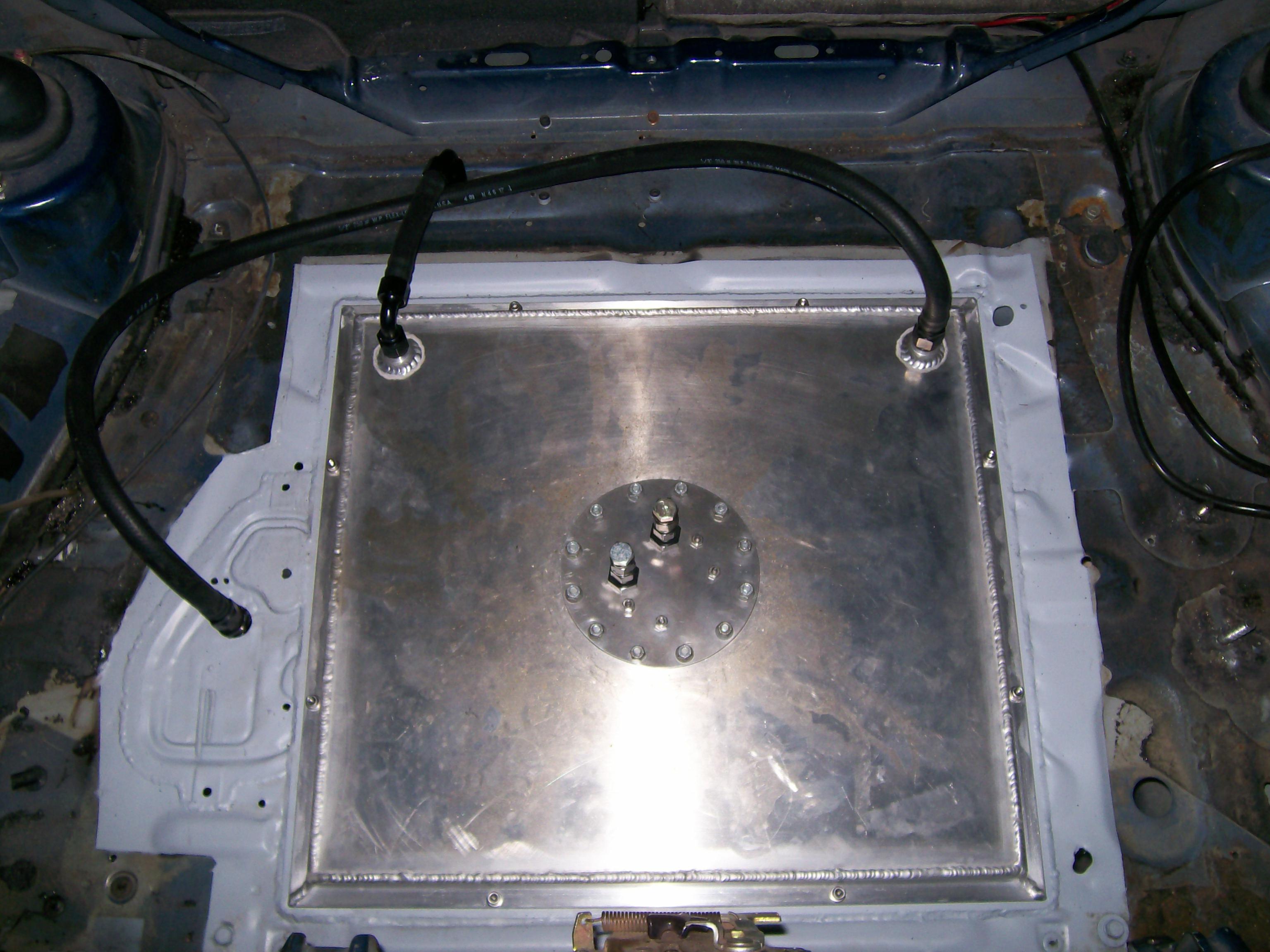 15 Gallon Summit Fuel Cell (mounted flushish with chassis, dual -10 feed bungs, stock fuel filler, and a custom dual -6 Walboro hanger that also has stock fuel level sender)