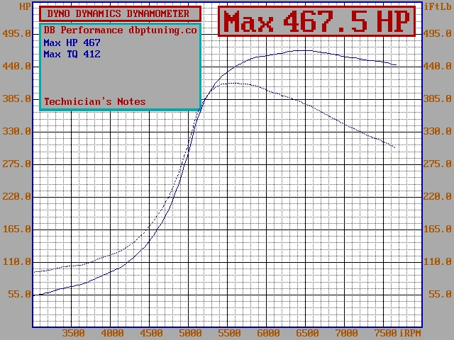 Revlimiter is set at 8200, but I didn't bring it out that far on the dyno run above. The power just continues to drop at the same trend. A different intake manifold should bring up the power a lot from 7000+ RPMs. I think it would make a good 550whp on an AWD Dynojet and a little more on a FWD Dynojet. On an older setup, pump gas, and 19psi it put down around 339whp on Elite's Dynojet in FWD mode and then put down around 265awhp on our Dyno Dynamics in AWD without any changes, but some time inbetween.