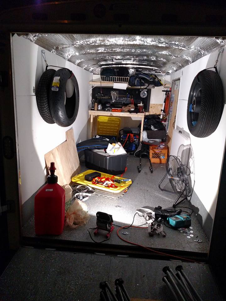 2 are of at night loading up/nearly done. The one in the AM after the 4.5 hour drive. (notice the gear bag fell down, need a 2nd bungie cord, spare helmets worked so that's done, few tools fell of peg board, suit hanging in back fell, so I moved that to the front after a gas stop 1/2 way thru the trip).