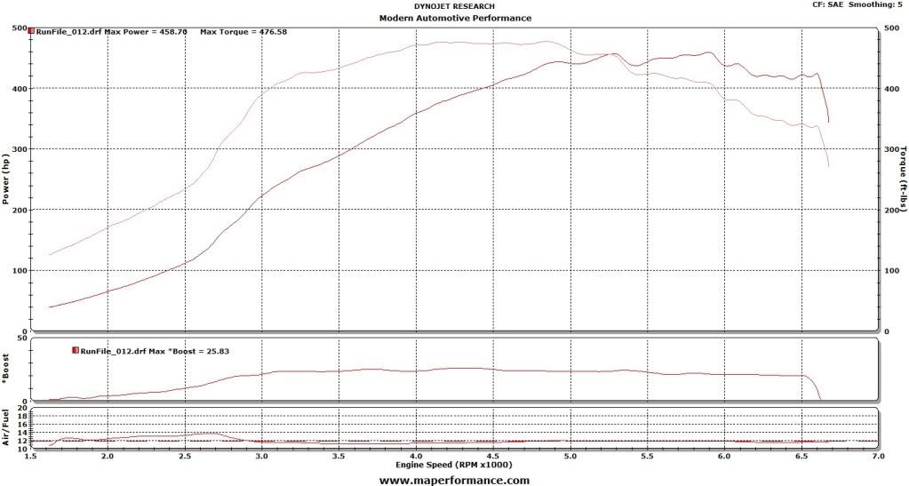 I recently changed my setup to the fp white turbo, it flows 10% more than the stock 9 turbo. As most of you know I have a fully built 2.3L stroker. Took the car over to MAP today to let jordan work on tuning it. Outcome suprised me at the boost level I had it at. At 25psi I made 458.70hp and 476.58tq. I forgot how the stock sized turbo's spool up, its alot of fun. Jordan said theres a bit more it it, I made on one run 465hp and 483tq but it was a bit lean, my single fuel pump is maxed out. I will have a dyno graph up later tonight. Im still on the stock intake mani and throttle body and an unported stock exhaust manifold.