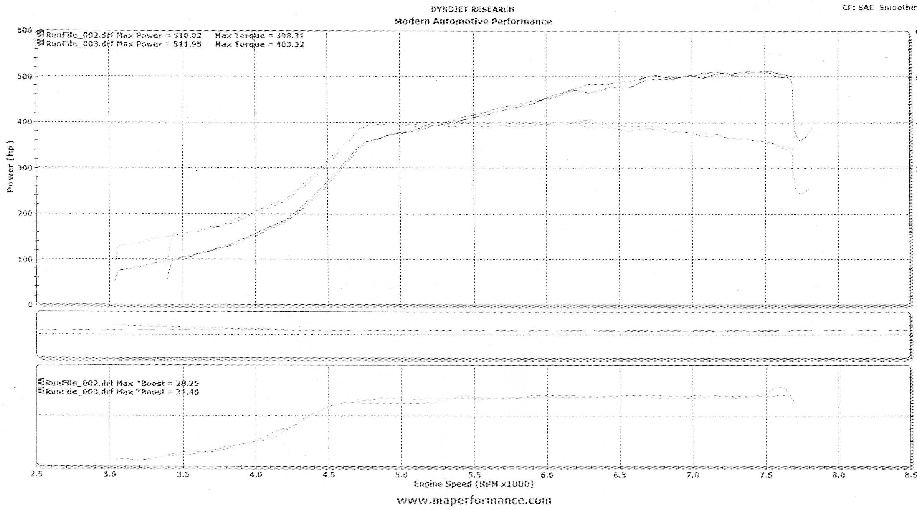 Just got back from MAP, thanks Jordan for getting me in on short notice. Pretty happy with the results. Best pull was 512 whp and 403 tq. Car was running 28 lbs ( last run says 31, but it only spiked there for a second at the end of the run ) on the 35r with a 75/25 meth/water mix. AFR was 11.7 through the run. Time for E85!!!