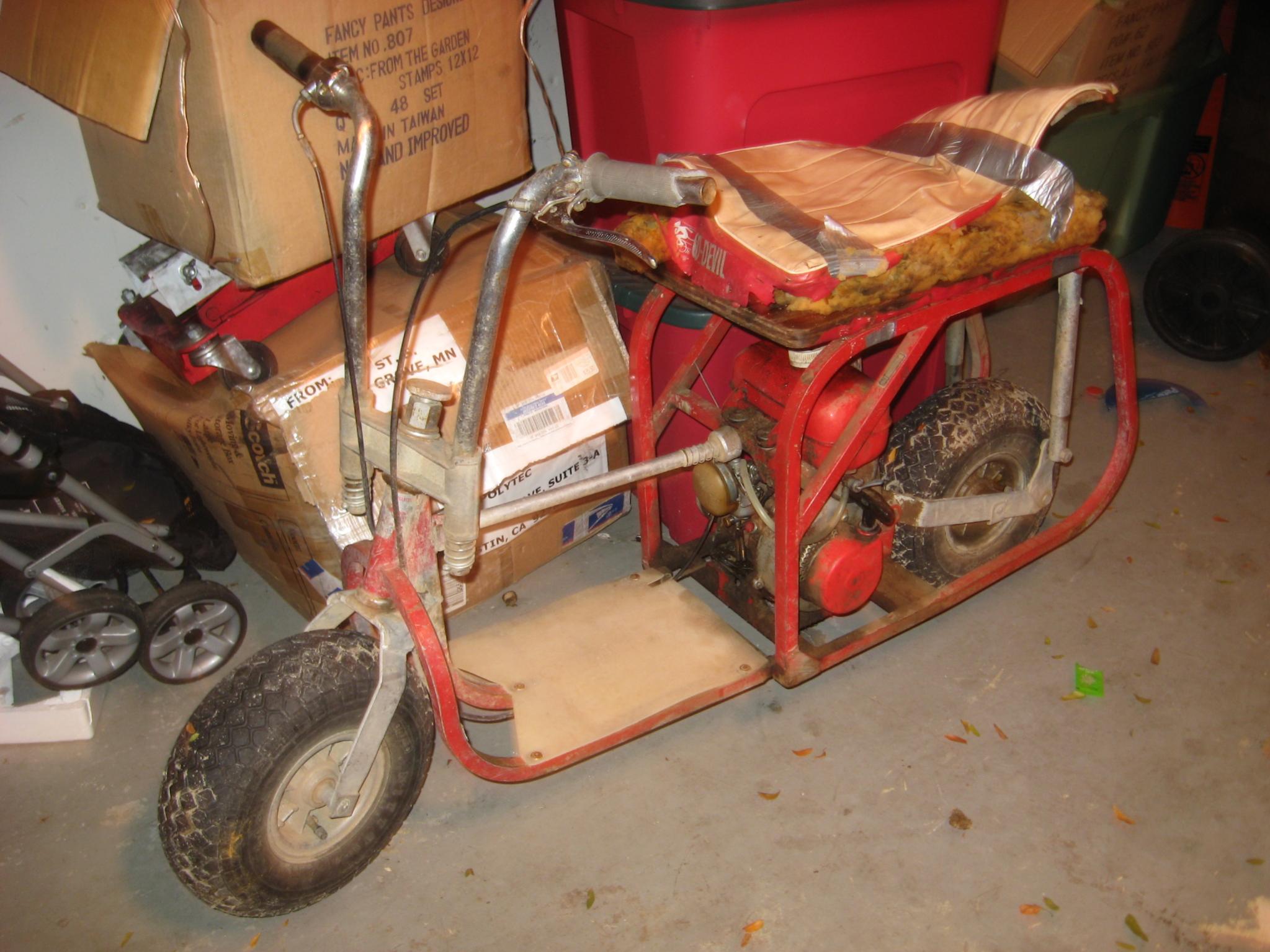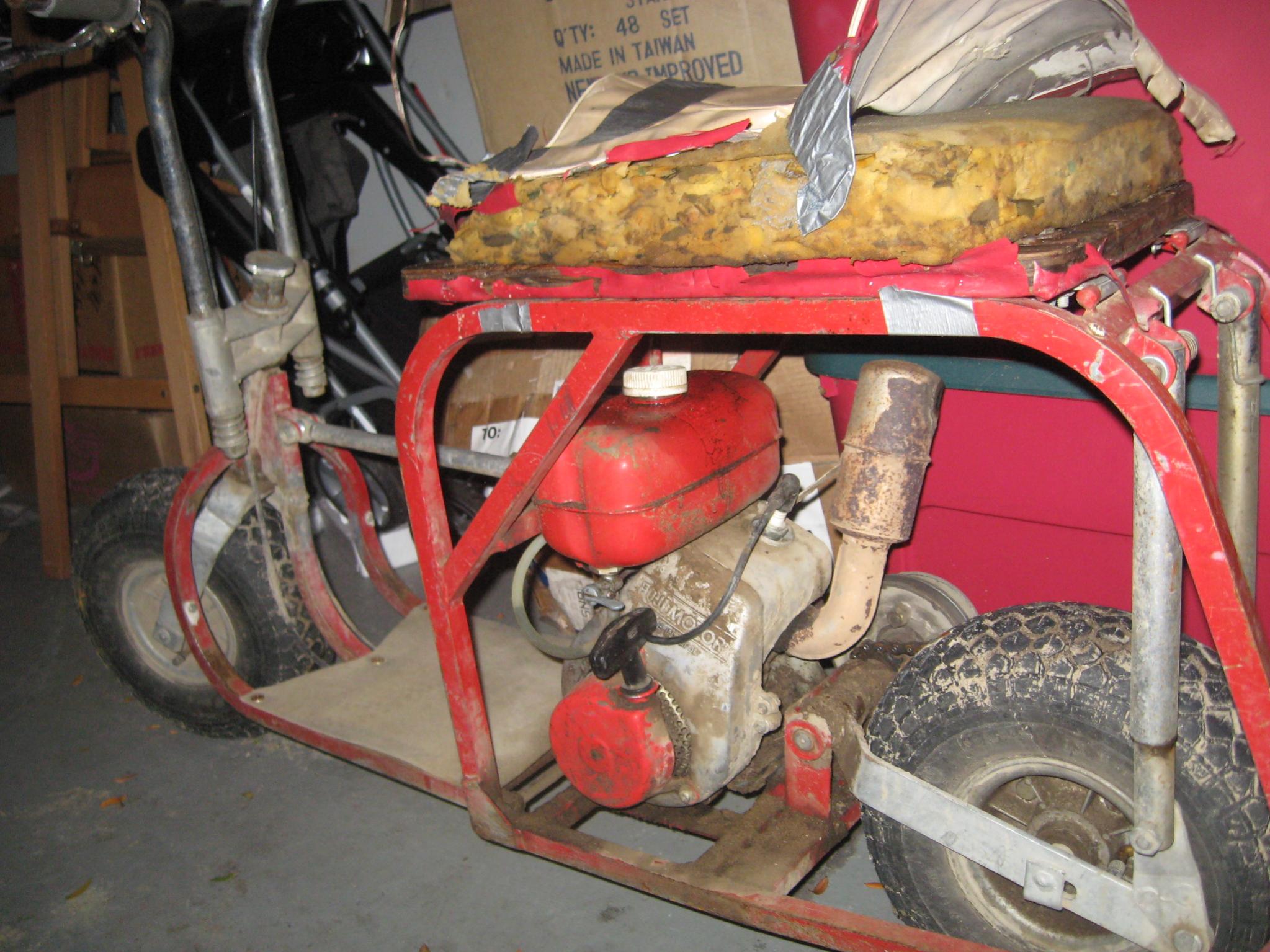 The Third and final, is a 1960s Fuji Go-Devil folding mini bike. . This one has a funny story. My grandfather owned a Aviation company called Bolduc Aviation, he would do maintinance and rebuilds on Small airplane engines (he was in WW2 as an aircraft mechanic, recieved his Master Mechanics award, and was inducted into the minnesota Aviation hall of fame, he passed away shortly after my uncle) well some guy had left it at his shop and never came back for it. Its a small bike that folds up for easier storage. Really unsure of the year or who the hell built it, but totally vintage, its a major feat that this thing still runs! I actually did a quick seach and found a youtube video from someone. http://www.youtube.com/watch?v=PGsbSj6Hb2k