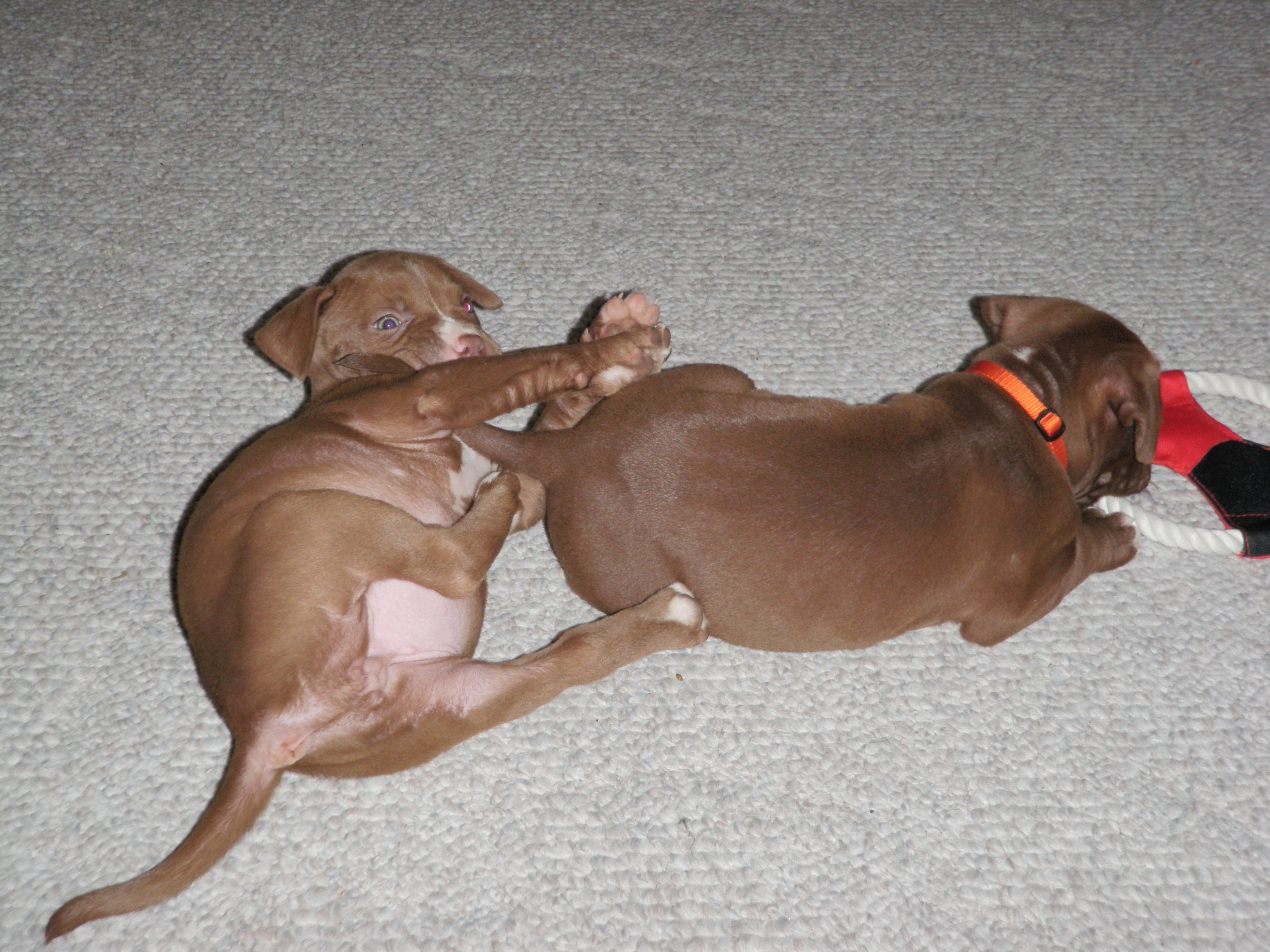 So my roommate and I picked up two Pitbull puppies. They are both 6 weeks old and are brother and sister. They are just like typical puppies eat, sleep, play and piss/s**t everywhere. Their names are Winsor and Jezza.