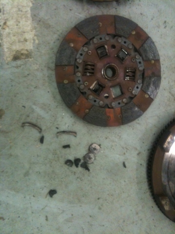the top picture is of the exploded clutch which i honesly dont know how happened its like it welded its self to the pressure plate and the friction surface on the back was broken up and the rubber cushions? idk what to call them, were all distoryed lol its quite impressive