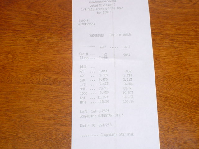 Originally posted by CUSTOMDSM@May 20 2004, 12:15 PM Welcome. Your profile says 11.8 in the 1/4 with and a best 60' of 1.7 with a FWD will SMALL in your modifications. You must be some driver.