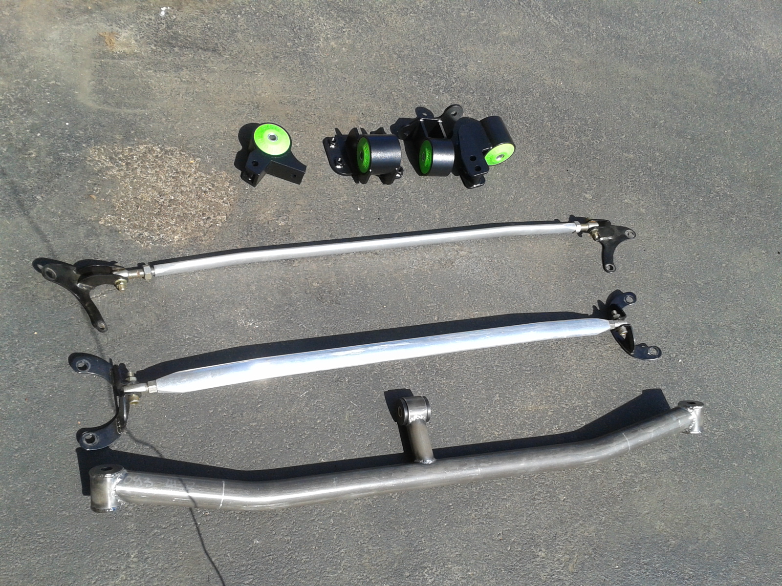 front and rear strut bars. drop engineering motor mounts. tubular from crossmember with poly bushing, and fic bluemax 1450's