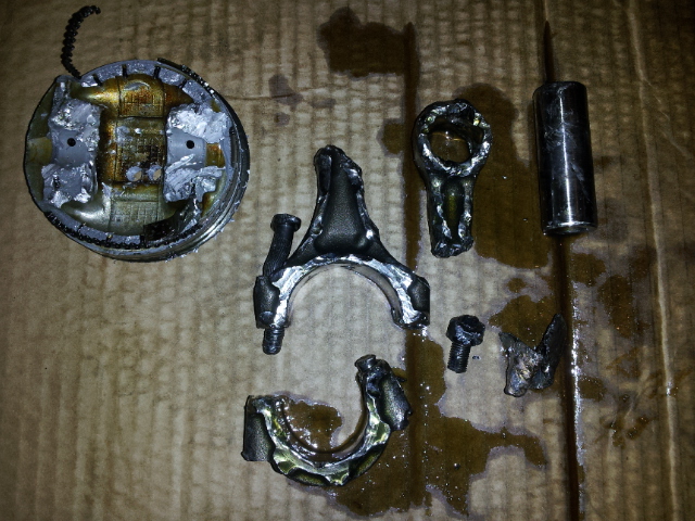 Was going on a little 'night cruise' Hit like 125mph.. coasting for awhile.. down shifted went to go accel again and I knocked, let off right away.. Thought I'd try it again and then boom!!! going like 60 maybe and only at like 10-15psi Remember hearing metal flying everywhere, seeing fire coming from under my hood and under my car, Shit flying behind me.. Pulled over and flames were shooting out the side of my hood, smoke just pouring out. Popped open the hood and everything was covered in oil and burnt. Smoked finally cleared.. and ohhhh helllooo that hole shouldn't be there... lol