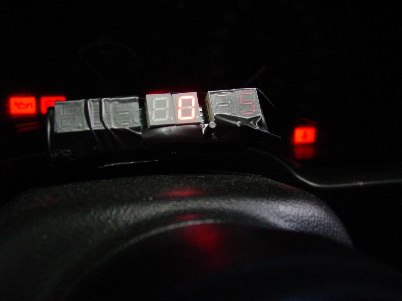Knock monitor covered in black tape and jammed into the steering column. The brighter middle number displays knock, the right number displays timing advance.