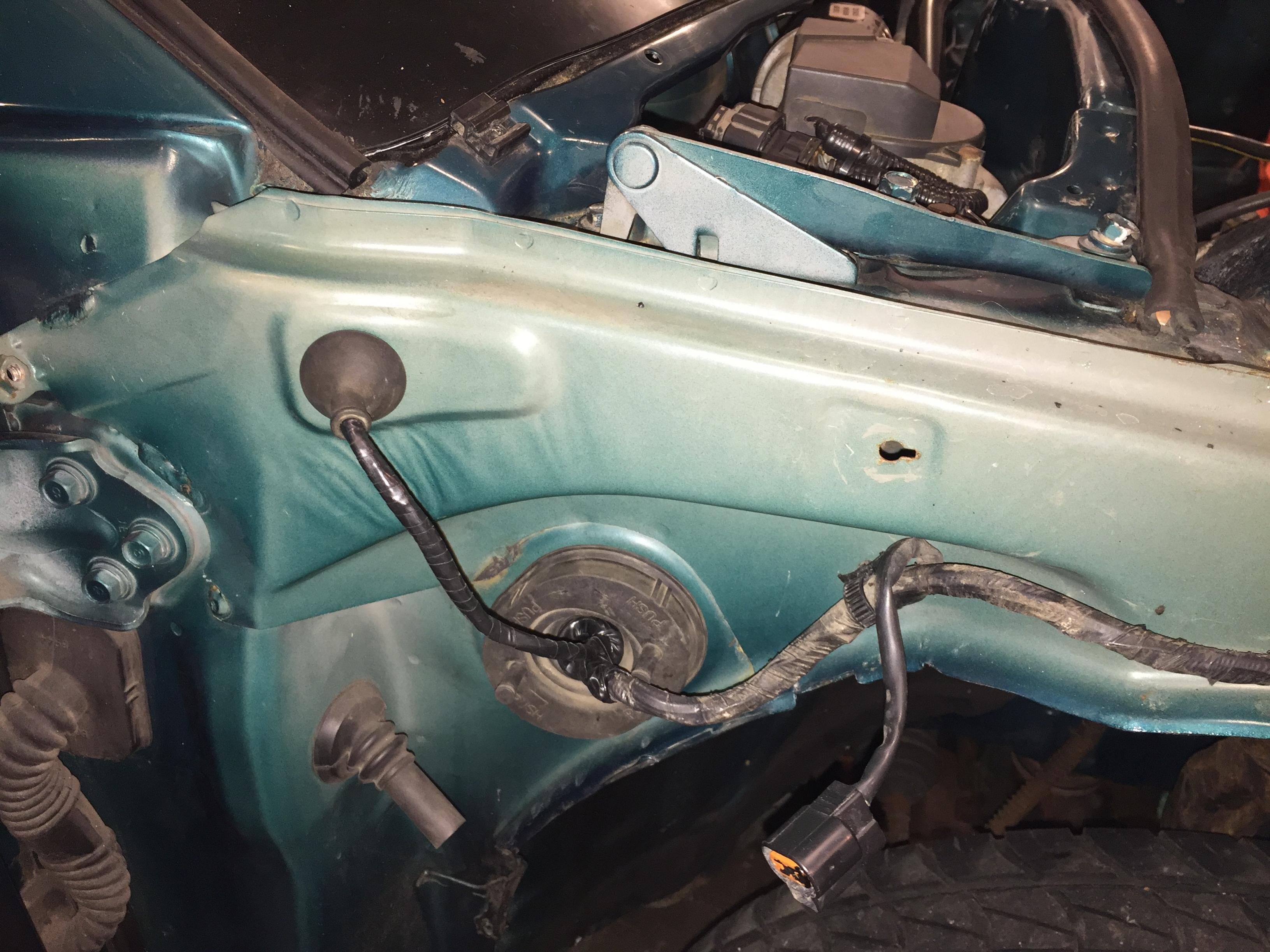 RUST!! Sometimes I hate MN. Typical 2G strut tower rust. I don't want that to spread so I cut it all out,welded in patch panels and got some PPG color match paint in a rattle can at Welle Auto. I am by no means a welder, fabricator or a body guy but I really like to do things myself if possible.