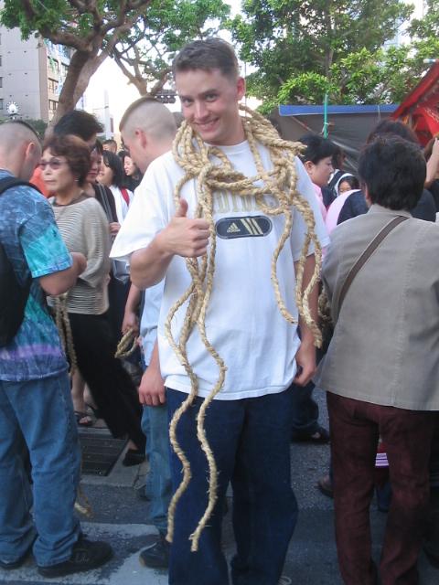 we got to cut off some of the rope to keep as a suvineir, but i left it in the trunk of the taxi. whoops.