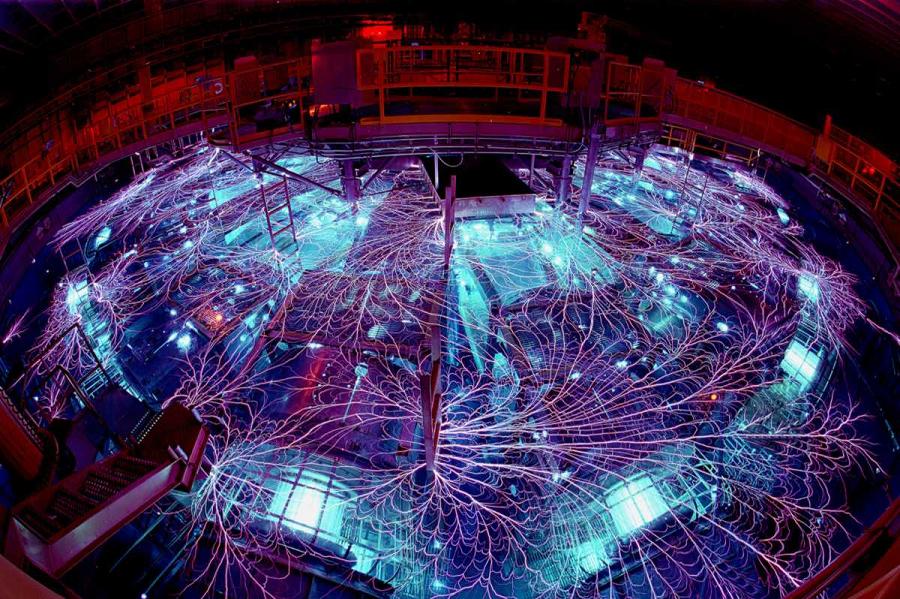 This is the Sandia National Laboratories' Z machine discharging AFTER firing.It's basically a huge bank of capacitors, which all fire into a tiny cylinder of human hair sized wires.