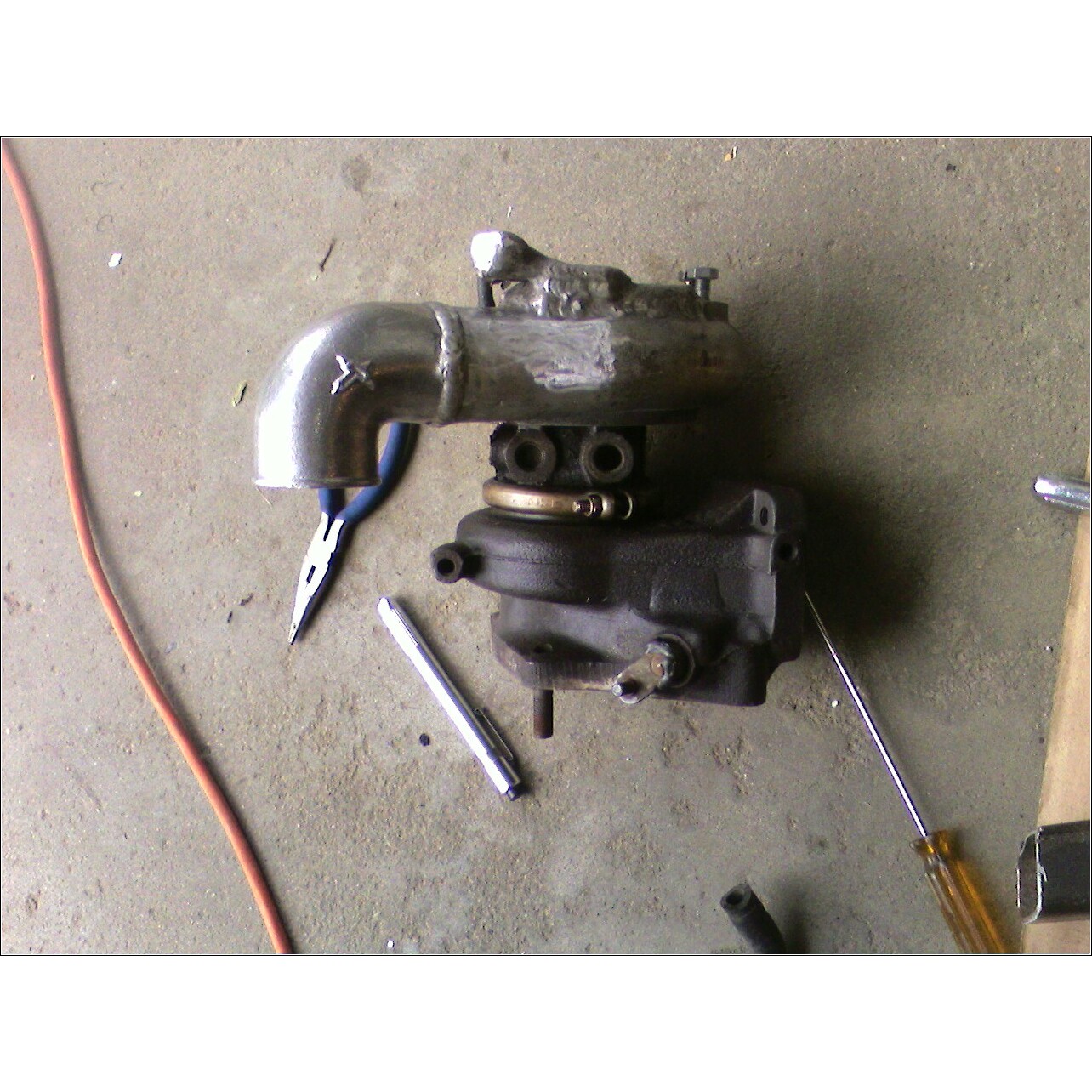 Has a turbonetics elbow welded on that faces the drivers side when installed.