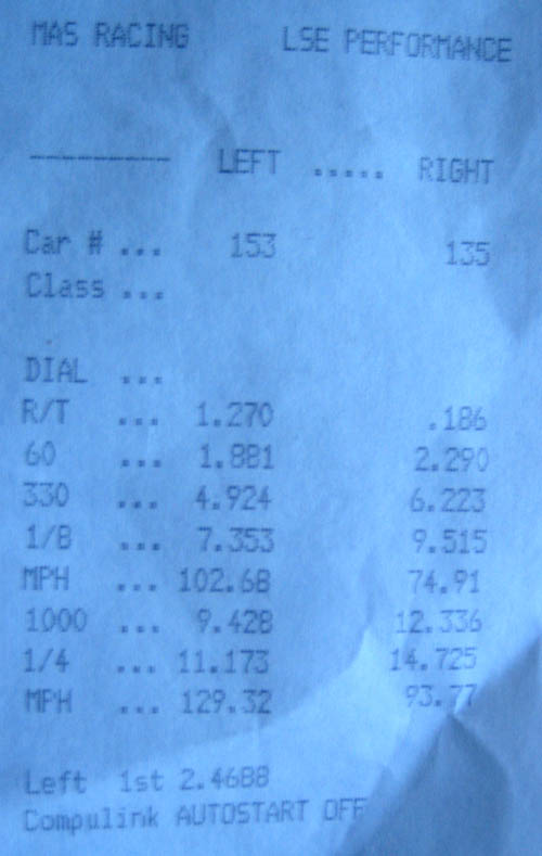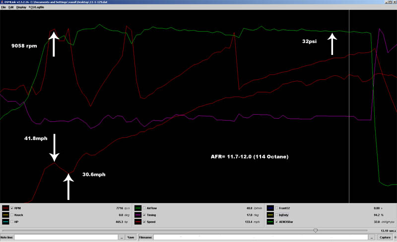 I decided to give it a shot on Saturday, so me and Tim (EvilEvo) went to test out the DSM with the new 3065. I usually remove the airfilter from the turbo at the track and this weekend was no exception. On my fisrt pass the FP3065 swallowed my O2 harness wire around the 1/8th mile, so it ended up being a shitty pass of 11.5@123 with a pathetic 60ft time of 1.88, the next run the car was missing so I hit the brakes and ran a 12.0@89mph. My third pass was relatively clean and the car ran an 11.1@129.3 again with another pathetic 60ft time of 1.88. I really need to learn how to launch my car, shift faster and get better rims and tires (currently 2G swirly rims with Falken Azenis 205/55/16). No excuses ... just more practice and more traction
