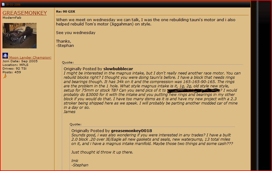 ^ You are a D-bag... I traded you a car for a built motor and money. The motor you built (less than 2k on it if I remember correctly) needed a rebuild due to you putting the bearings in it wrong. Mark (TKR) looked at it and fixed it. It appears that Tom had a similar issue with his motor that YOU built.