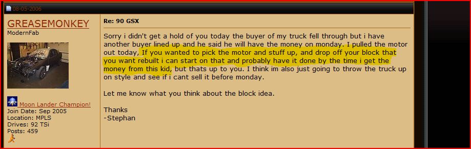 Anyways all of a sudden he must have realized that he bought a project that he couldn't handle and decited to bash me about it. And if anyone cares to read my FS post about the car (If it hasn't been deleted) It stated that the car is being sold AS-IS!! I explained to Tom that i hadn't pulled the oil pan off the car and that i had no idea what the extent of the damage was.. He was perfectly ok with this and had no problem buying the car still, Please keep in mind that he came and looked at the car in person and really wanted it.