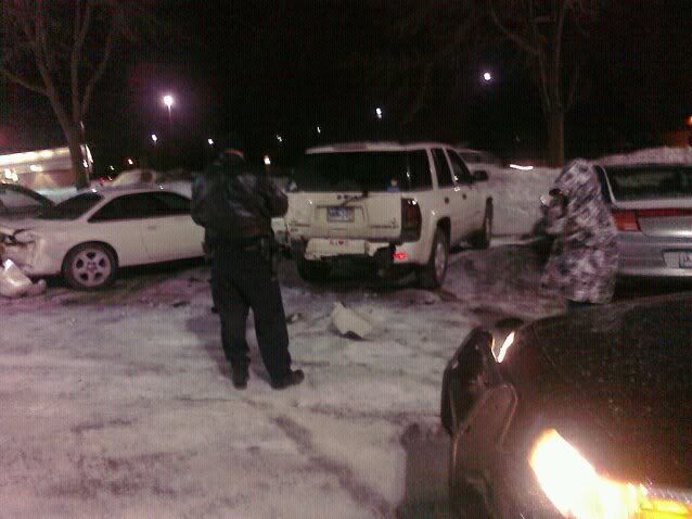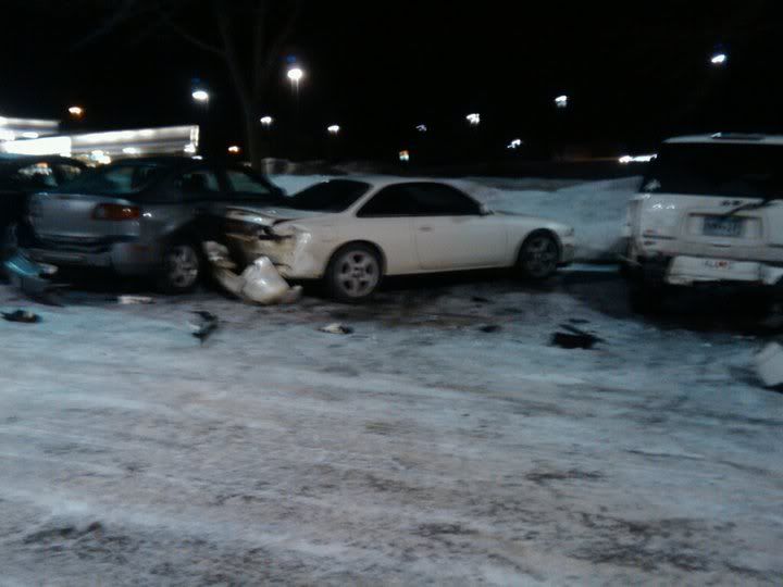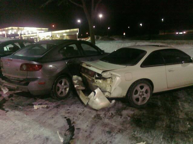 So last night I decided to meet up with one of my coworkers and his gf at Primetime in Burnsville. At about 12:45 he comes running in from having a cigarette and tells me to come outside cuz my car just got smashed into. I walked out to find this: