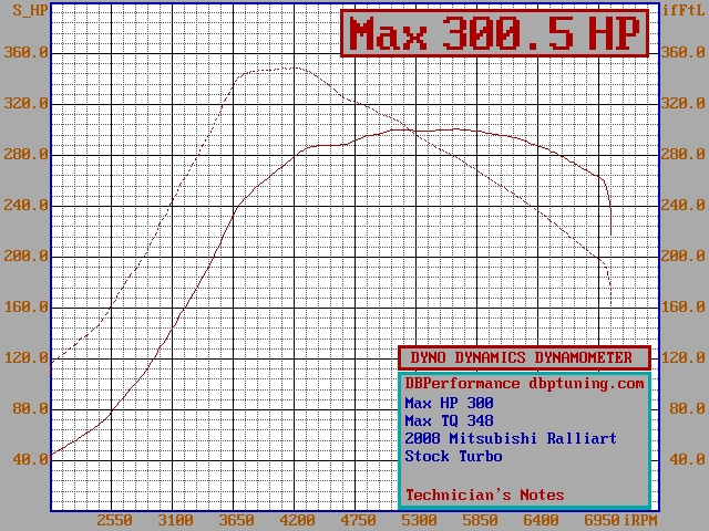 The attached dyno sheet is a Ralliart on the stock turbo that I tuned on E85 cranking the hell out of the tiny turbo. The numbers are in shootout/dynojet mode though.
