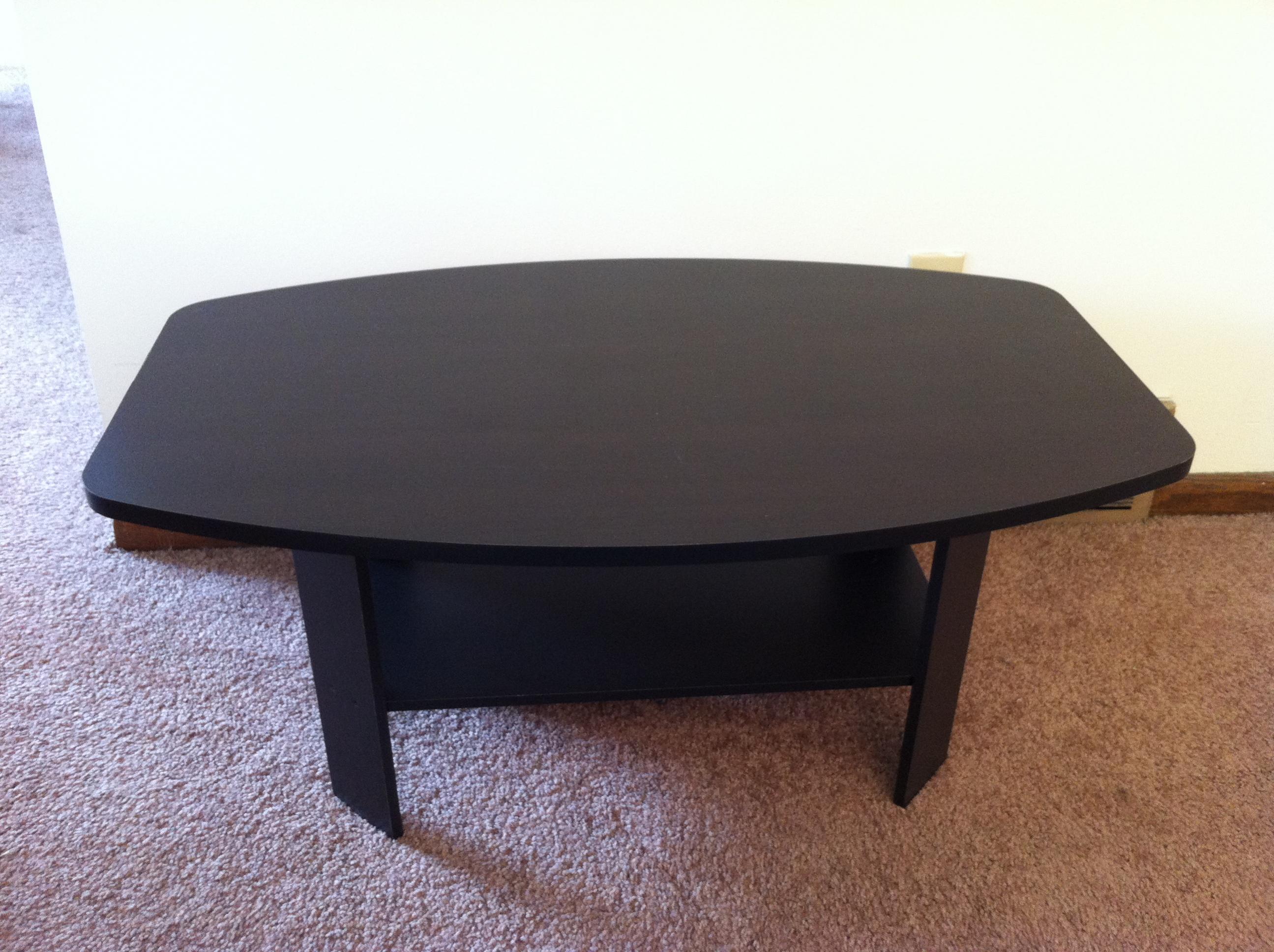 Small coffee table, looks black but it's dark brown. Cheap but looks decent and it's plenty useful.