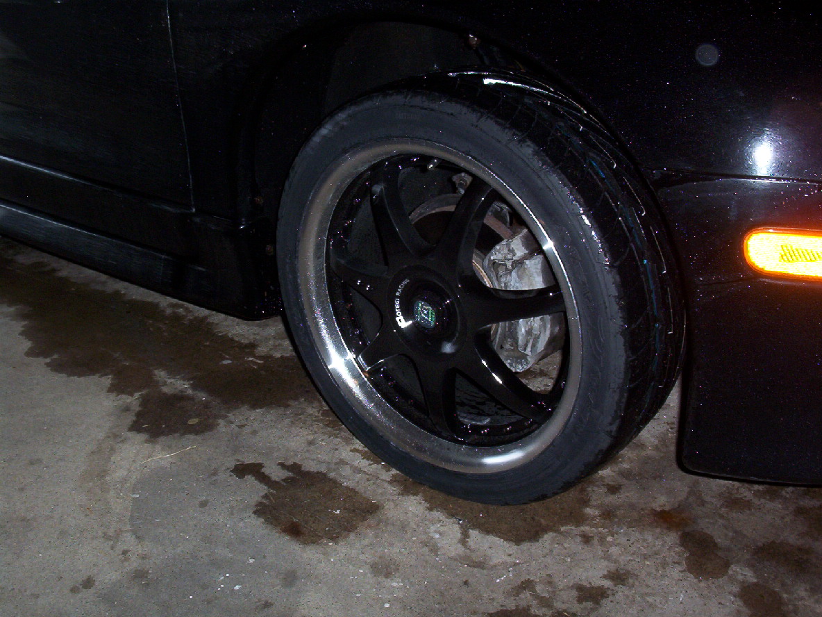 Bad pic but its a shatty day out. They are 18" Black Motegi FF7 with Nitto Neo Gen Tires (225/40/18)