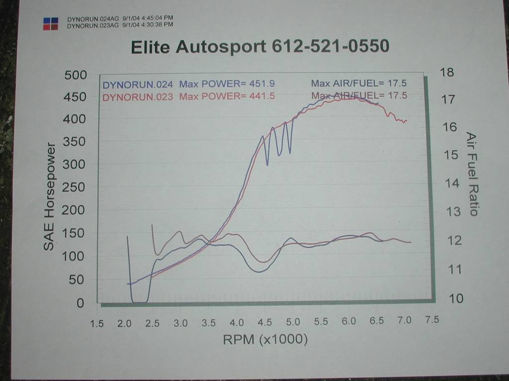 Then threw is some VP race gas (C16) and raised the boost another 10lbs (28lbs) and the car put down 451.9 HP and 416 lbs or torque. My plugs were done and we grabed the ones off Shane's car and then Cher snagged some from another DSM, they weren't the greatest but were better than mine. Next time I will be prepared and show up with a few sets. The really cool part is that we reached this power level around 5770rpm