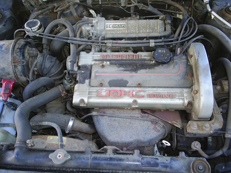 It has the little brother of the DSM motor, a 4G61 with an 11b for a turbo. Think 4G64, only go the opposite direction on displacement. Everything is identical and nearly everything that you can pull out of a DSM engine bay can be bolted onto this 2400lb pile of 80's trash.