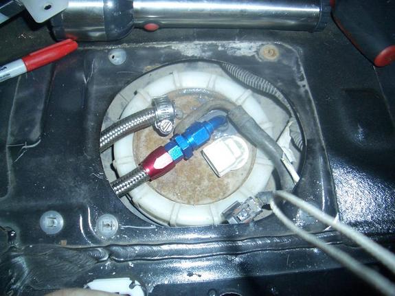 Thought about doing that. I even went to db and got the fittings, but didn't want to mess with the factory pump o-ring piece thats on the other side so instead I ended up cutting one of the male -an's off drilled it out to match the line diameter and welded it onto the line. I'm hoping it will not leak. Last night I f'd up the hardline under the car trying to drill that out so my next question is, will it leak if I just put the hose over the line and clamp it down? It's the feed hose right after the pump.