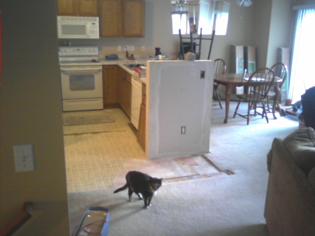 Well started spending some more of my tax return. Here's my current mess I'm living in now. The counter was cut back 1 cubard space like I showed above, and built a new end cap wall on the end of it. Mud is currently drying. The room already feels so much more open now with that counter cut back. It made a huge difference.