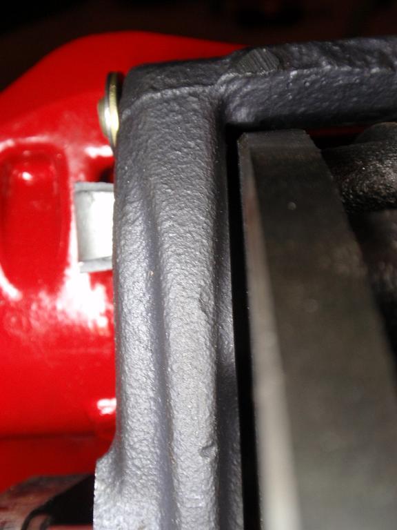 OK well, the install is 99% done. All that's left is to clip the brake lines in the middle somewhere, probably on the stock bracket. Just want to install the tranny and axles before I decide on the permanent clamping point of the lines. One thing I will mention, was that I did have to do a little bit of sanding and/or shimming on the spacers that were included with the bracket kit, to get the calipers perfectly centered on the rotors. They were "OK" with the just putting in the spacers, but weren't perfectly centered. I just decided to be nit picky and get them as perfect as I could. Both bottom bolts have the spacers left as is. The top bolts I sanded a little, but sanded too far, then put washers on as well. The spacers were about 1/32 too long for the tops. So like I said, hardly off at all, I was just trying to be as perfect as possible.