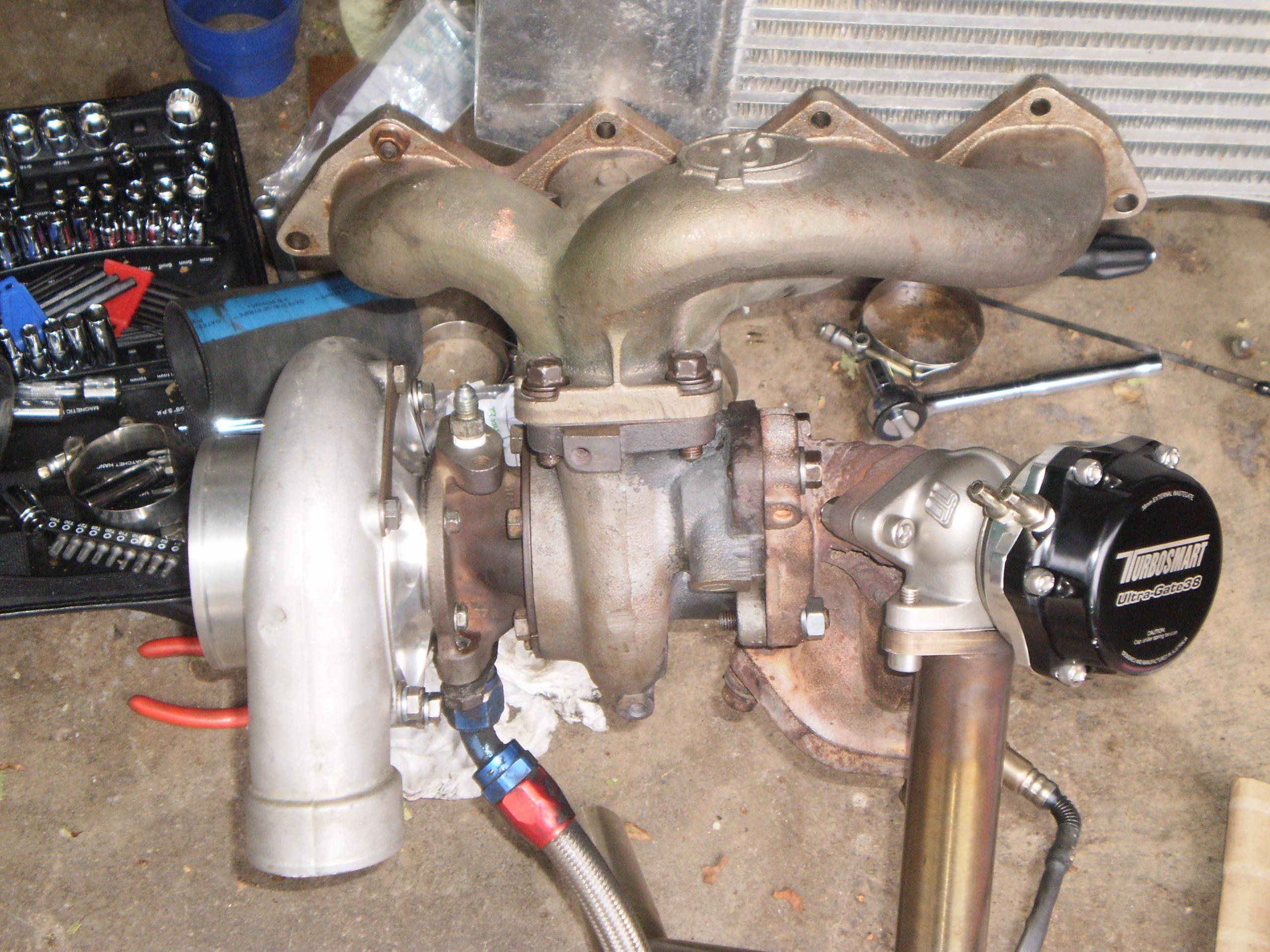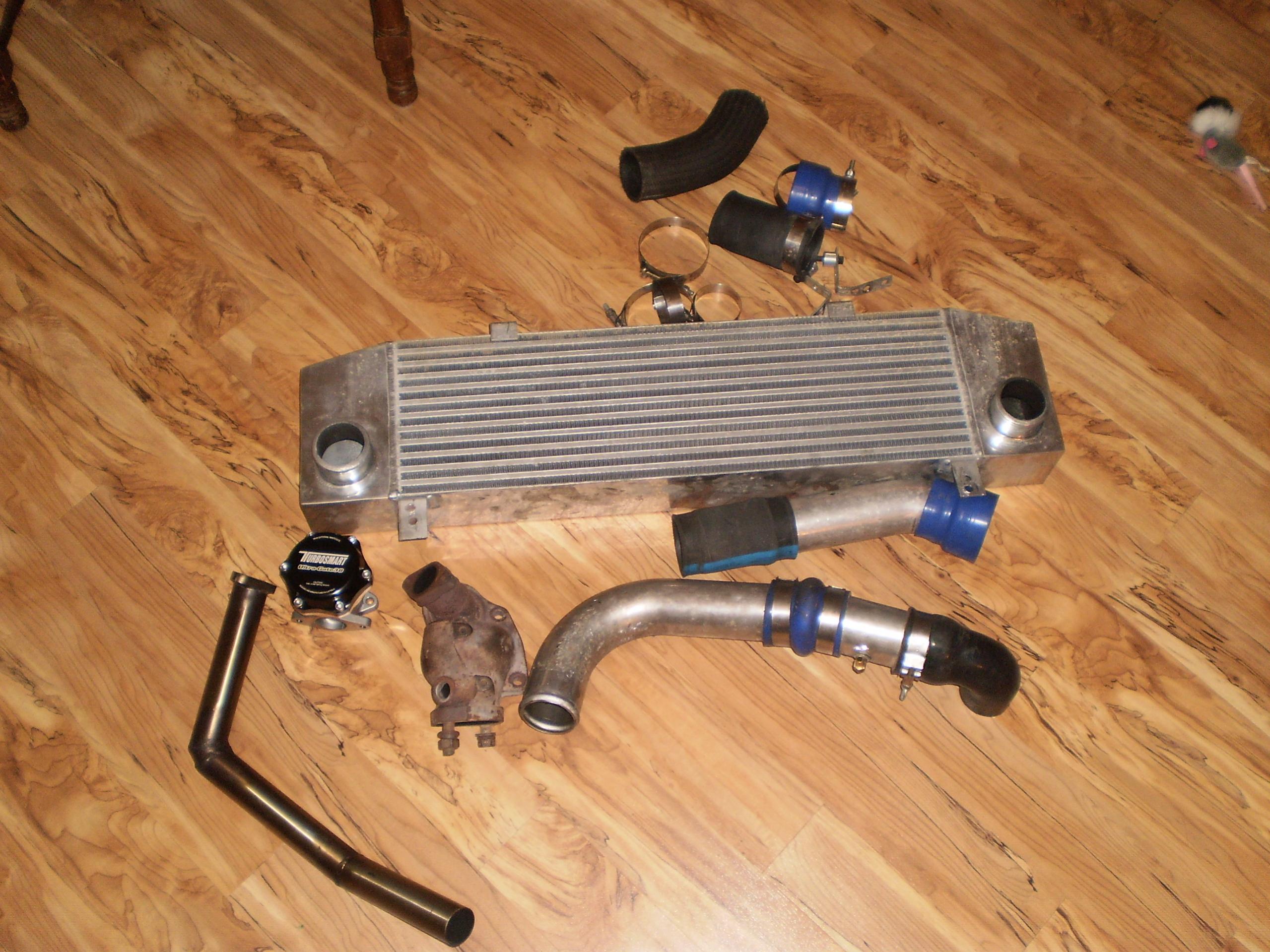 well so since my turbo ate a chunk of rubber i've been working on picking up parts to get her back on the road. I've picked up a used punishment racing fmic kit, a ported 2g o2 housing modified for an external wg and a dump tube, and a turbosmart 38mm wastegate. should be picking up a turbo this weekend.