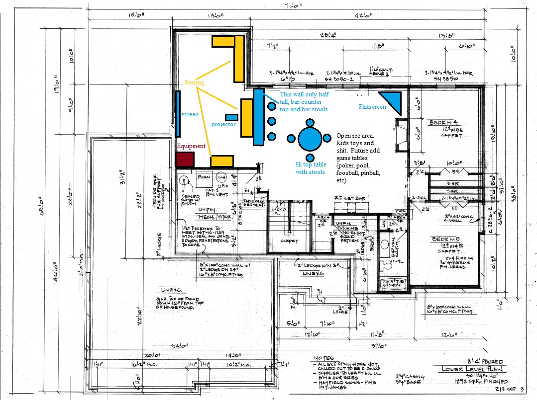 Basically what our thought right now is, that whole wall/door that separates the living area from the theater room is coming down. We originally thought it'd be nice to have that room totally secluded, but we're not the secluded type. We like open and spacious. So that wall will become a half wall with a bar/counter top on top of it, with bar stools along it. No more door, just an opening to walk past the half wall to enter that area. A projector will project on the long wide flat wall so you can see it from anywhere in the basement. The current furniture will move from the area it is now, to the other side of the half wall, that area will become the main TV area. We will still leave the flat screen TV in the corner by the fire place, but that area is going to become just a big open common recreational area, likely filled with kid toys. In the future, probably throw some game tables (Pool, Foosball, Pinball) over there. Also where you see the small little wine cabinet, we will be building a wet bar that goes against that wall.
