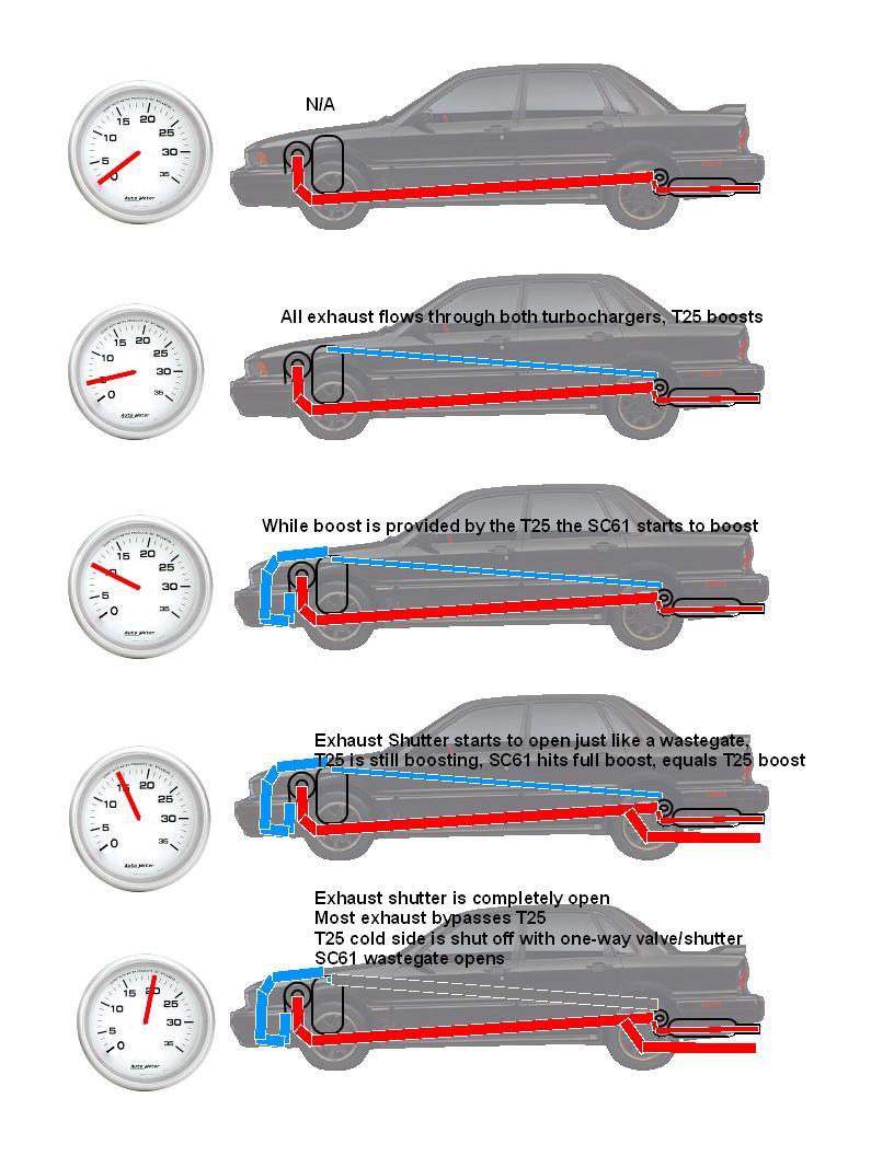 I can solve the problem for the exhaust side, it will only flow through both turbos when the t25 is boosting, and when the sc61 reaches full boost the cutout will be completely open, and then the t25 will be basically not be in the equation anymore.