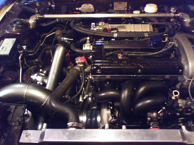 Today I got the SS socket head cap screws put on the valve cover. Got some new studs for mounting the TB. It is mounted now. I had to take the coupler off the TB and put it back on. I'm getting better at it, but what a PITA. Anywho, got the TB mounted with studs and nuts, got the UIC pipe on. Took the turbo off because I want to take the coupler to work tomorrow and cut it down a little bit. Also need to modify the lower IC pipe. So will be taking that to work tommorrow to cut. Also got a new coupler from Napa to replace the ghetto one that was going from the FMIC to the UICP. I took the air filter off to give it it's yearly cleaning. It gets pretty dirty in that fender well. Also took off the old small mitsu filter and replaced it with the ultra small RX8 filter. Getting close! All I have for a camera right now is my cell phone, so sorry for the shitty pics.