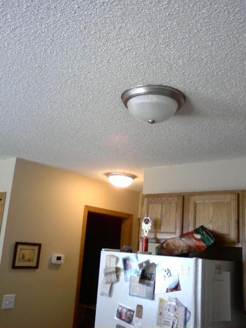 Also for anyone else interested, Menards is selling light fixtures for dirt cheap. I got the 13" ones. A 2-pack costs $12, so I bought two of the 2-packs. Replaced the two kitchen ones, and have yet to install the other 2 which will go in the stairway and the other one upstairs. Here's a pick of the ones in the kitchen.