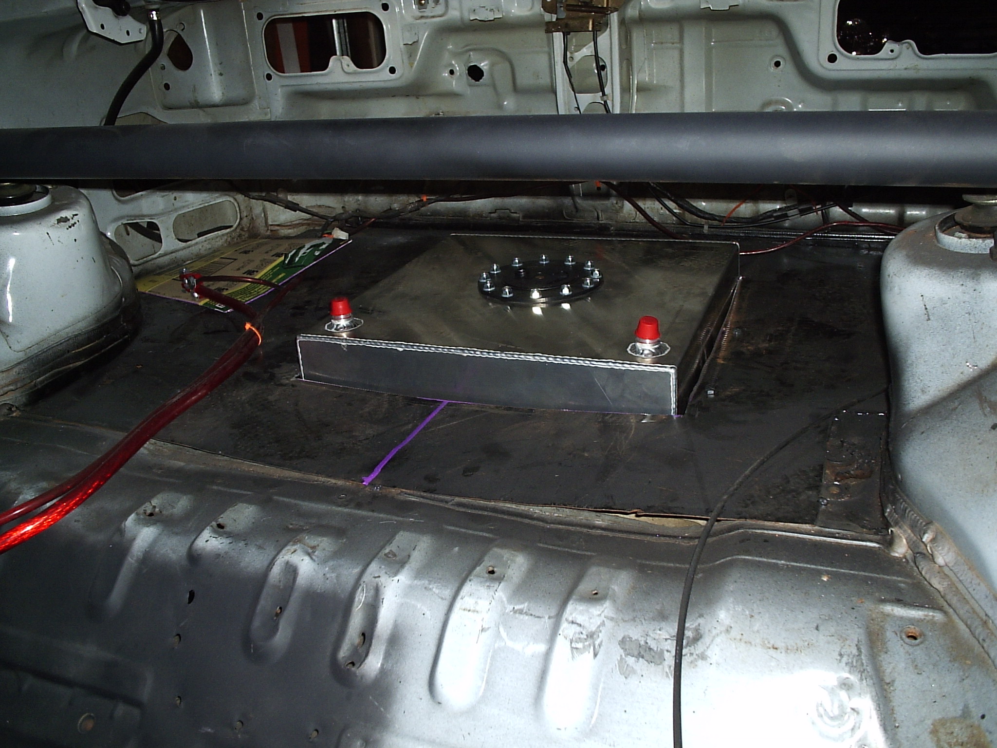 Over the weekend i managed to get all the fittings and other misc stuff to finish up the fuel setup. I had my buddy who works at a steel company shear me some 2" x 60" 16ga steel strips. After about 45 minutes i had the brace done and ready for the cell to go in, Im actually really happy on the way it turned out. At the moment though im regreting not painting it, But i think im going to pull it off and throw a couple coats on it just so it doesnt rust away.