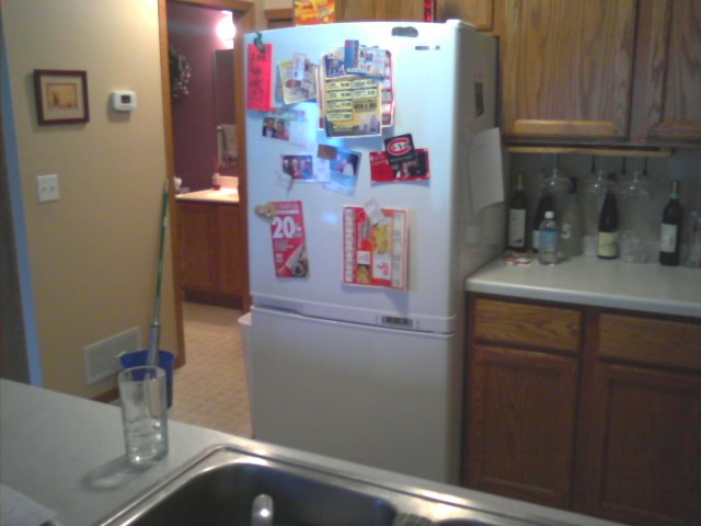 So I decided to get cracking on my main level. Already have the new appliances as I mentioned earlier (fridge, stove, microwave, dishwasher, clothes washer/dryer). So now the first step is to replace the kitchen flooring that is trash. I had a bunch of Home Depot gift cards, so I just went and bought a bunch of Light Oak Pergo flooring that will be going in the kitchen/bath/laundry. Also I am eliminating one cupbard spot. Reason for that is the way it's setup right now makes the dining room huge, and the TV/couch area small. Moving that end over one cupbard spot will help eliminate that. Then once the counter is modified, and the flooring is in, I'm going to get the whole room and the stairway coming up to the main floor re-carpeted.