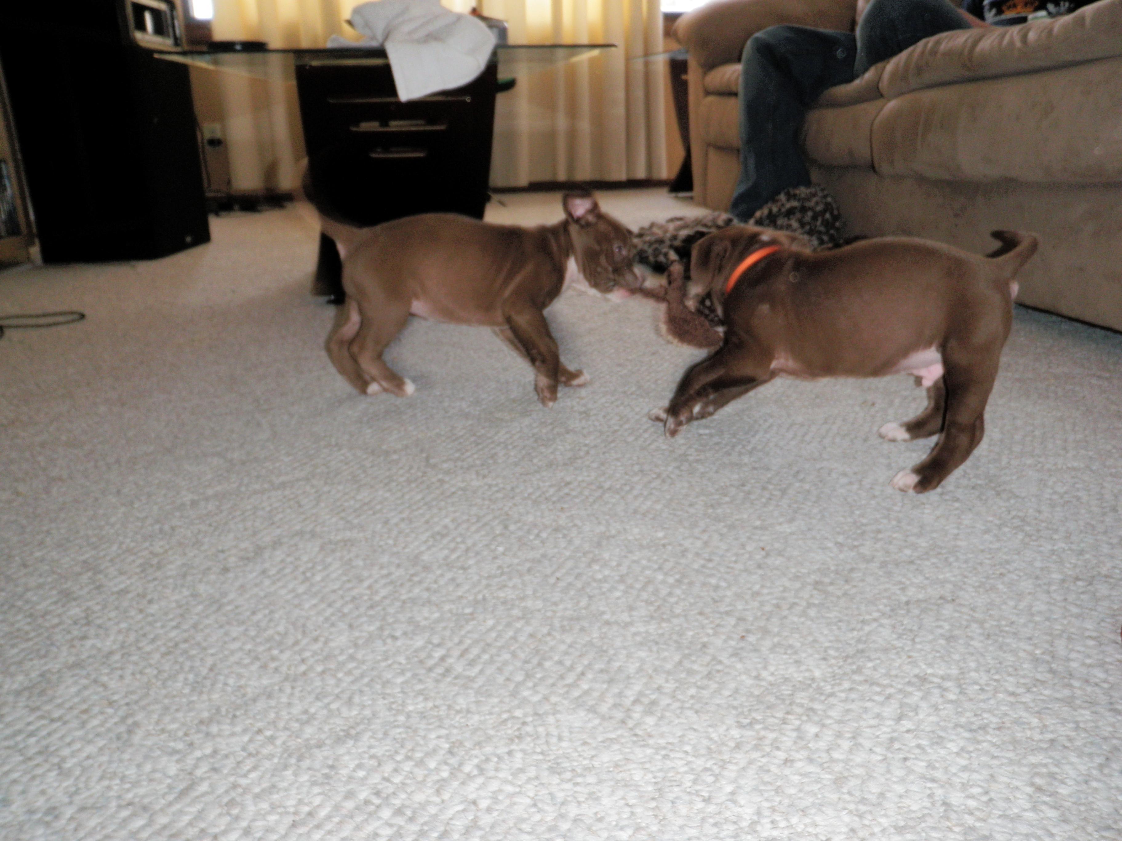 So my roommate and I picked up two Pitbull puppies. They are both 6 weeks old and are brother and sister. They are just like typical puppies eat, sleep, play and piss/s**t everywhere. Their names are Winsor and Jezza.