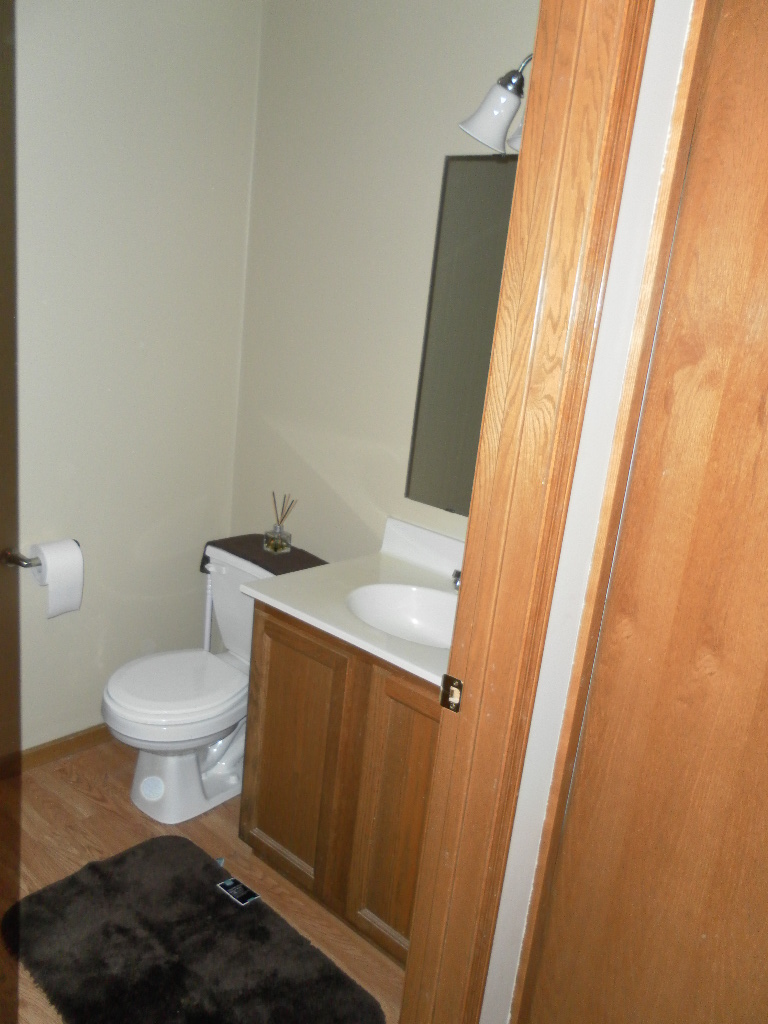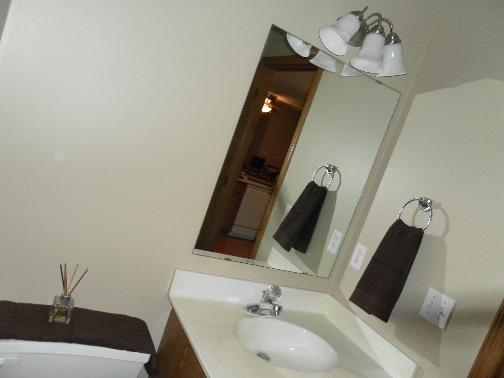 Bathroom, the linoleum flooring will be removed and replaced with tile. Haven't decided yet if I'm going to tile up the walls like I did downstairs, but I'm leaning towards not. New light fixture. Paint. New shower curtain rail (got one of those curved one from Menards for $10). New Shower head. And for now that's probably it.