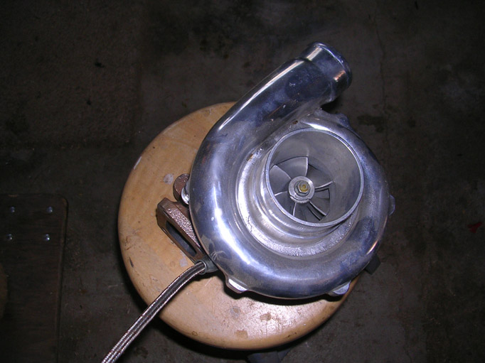 Its a T3/T4 50 trim turbo made by a company called Master Power (personally never heard of them, but he picked it up for $300) he is also picking up a Manifold for the T3, with the wastegate flange on it.