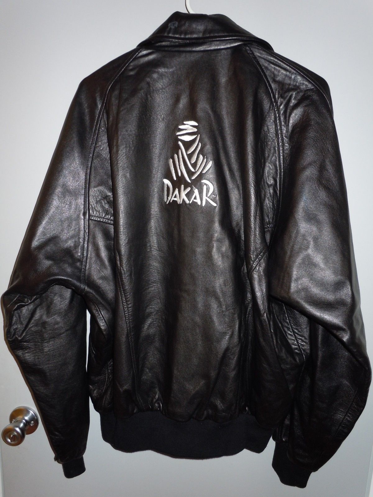 Submitted for your consideration. I have up for grabs a Large black leather Mitsubishi Ralliart Dakar rally jacket with 2 front pockets, 1 inside pocket, full zip, 2 lower snap buttons, and 1 upper snap button. Has a hole in the collar and 1 in the sleeve both not very noticeable. Leather is soft and liner is in perfect shape. Good for fall or winter with a sweater underneath.
