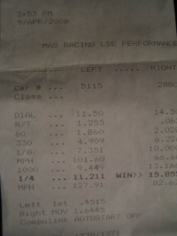 The place was packed up with cars. I was could not hook up my first run and then I boged it a couple of times. I was hitting 2.0 60' times. Finally I launched it at 6200 rpms and gave it a lot of hell and I hit a 1.860 60'. The best run of the day was an 11.2@127.9 The turbo is still the same FP3052, the boost was spiking to 34psi and settling at 31psi. Still running the same 2.0 I had 3 years ago, but now with double springs, built tranny and a quartermaster twin-disk . Here is the time slip ... I was really excited that I hit 101.68 in the 1/8th mile