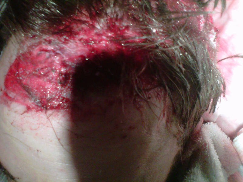 Wow. Iam glad I had a helmet on when I crashed twice. those scars will remind him to wear a helmet next. Glad hes alright.