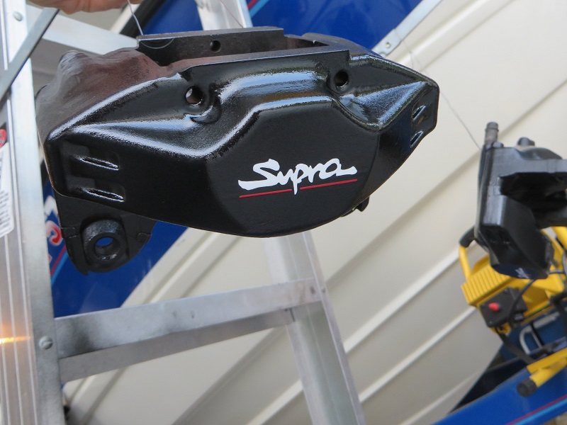 So in the mean time while I'm waiting for the new diff, decided to work on the rear brakes. The 16" FD rims I picked up as my poor mans drag setup didn't clear the calipers by a nut hair. So I ground a couple spots down on the calipers ever so slightly. Then primed and painted them to match the fronts I did a couple years ago. Here's how the sit now drying. Then they'll get the Supra stickers and some coats of clear, and then back on the car!