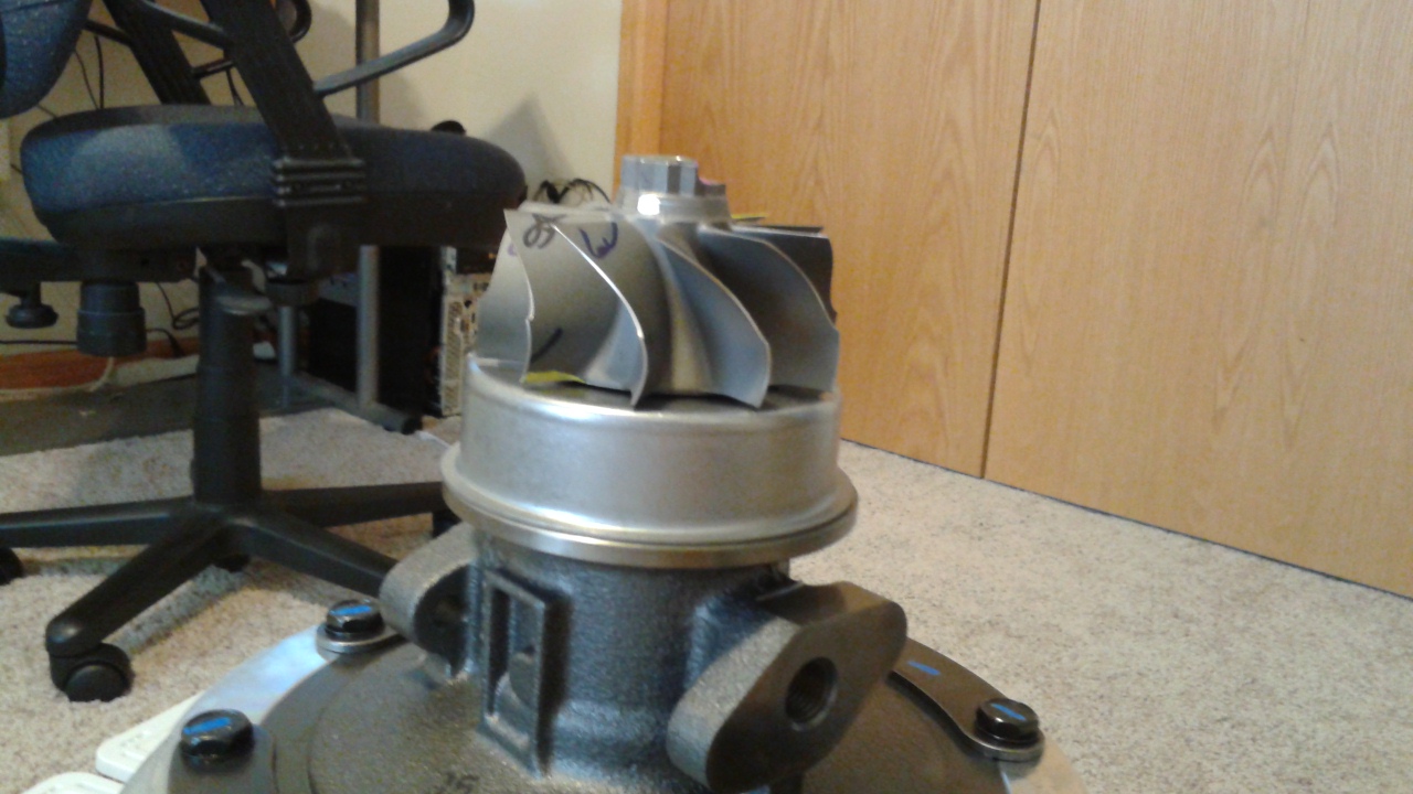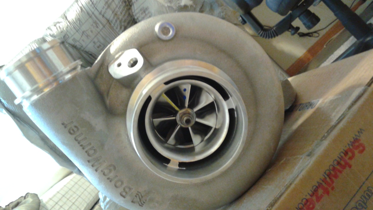 This is a new Borg Warner SXE-300 8776. So it's the 64.5mm comp wheel, which can be paired with either the larger (73mm) or smaller (67mm) turbine wheel. I went with the smaller turbine as its actually very similar in size to my current turbine wheel. And if you think of it in PTE terms, this turbo would be called a 6467, so from that perspective it seems like a pretty good combo to me. Plan will be to reuse my current .91AR T4TS turbine housing, but I may switch to a 1.0 T4TS just to see if I'm choking it out.